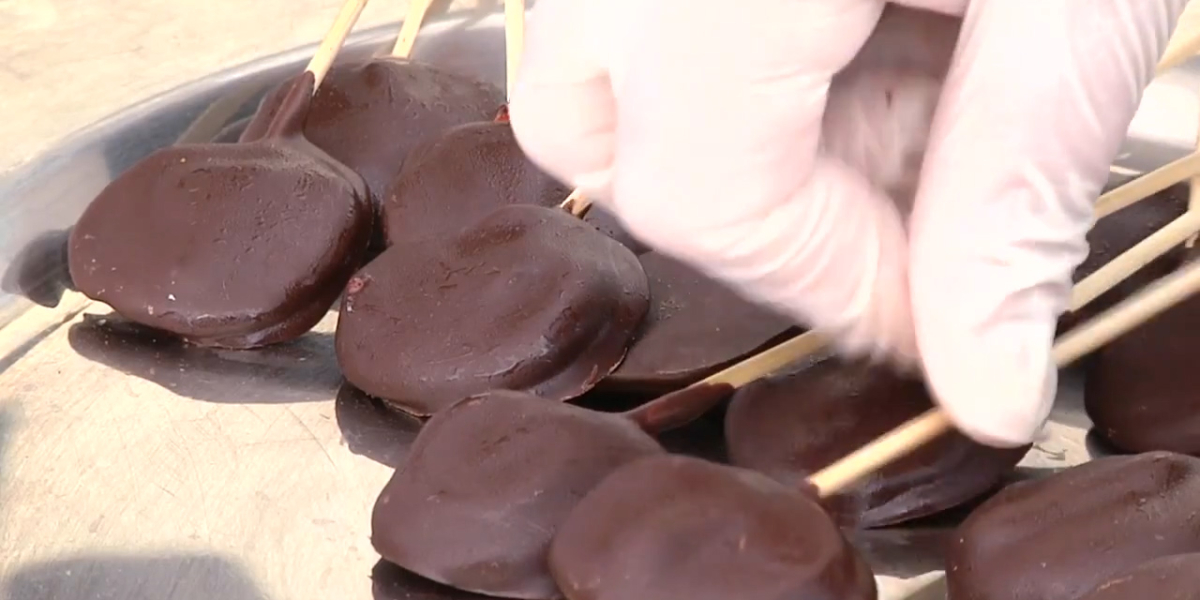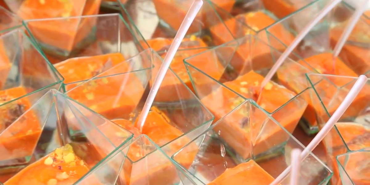 - Semifrio de yogur y fruta de la pasión con brocheta de fruta natural y coulis de frutas del bosque.